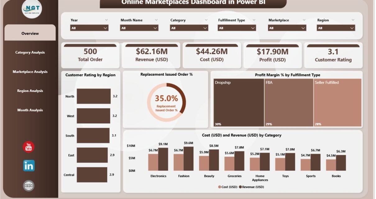 A Power BI dashboard is a visual interface that consolidates key performance indicators (KPIs), metrics, and data insights into interactive charts and reports. The Online Marketplaces Dashboard is specifically designed to monitor performance across multiple online selling platforms, providing real-time insights into sales, costs, profits, and customer behavior.