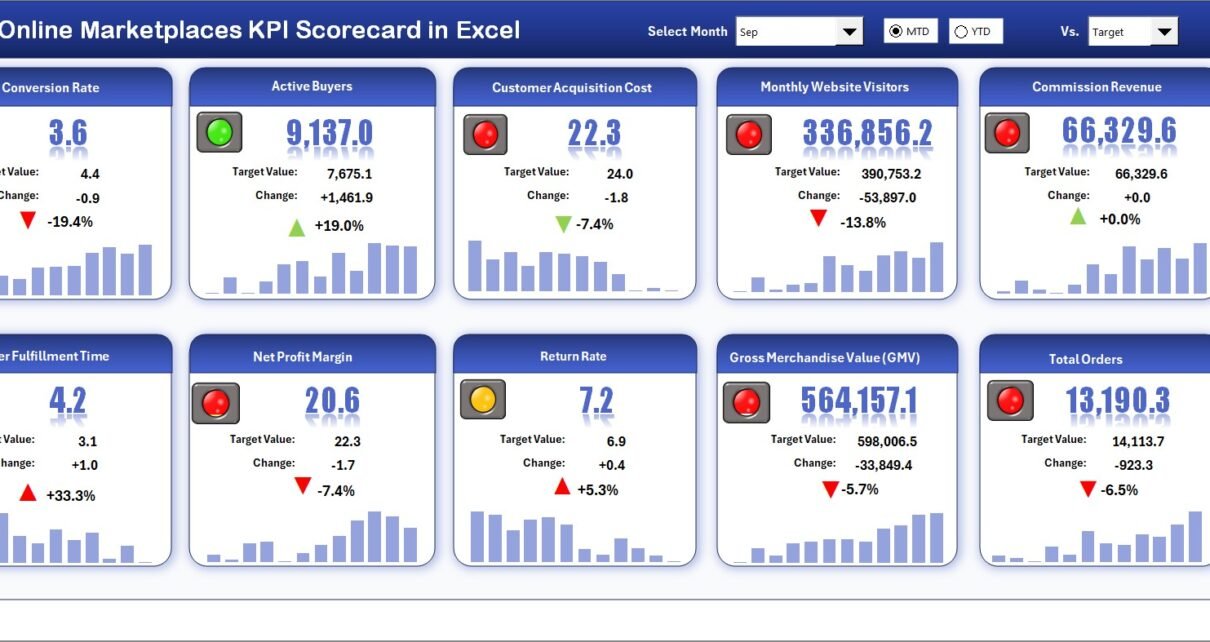 An Online Marketplaces KPI Scorecard in Excel is a ready-to-use performance tracking system designed to measure marketplace success using Key Performance Indicators.