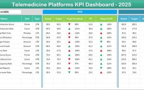 Introduction The Telemedicine Platforms KPI Dashboard is a comprehensive, ready-to-use template designed to help healthcare providers and administrators monitor and