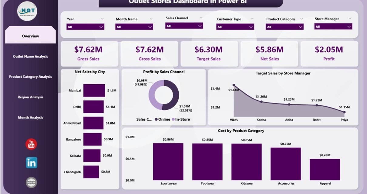 The Outlet Stores Dashboard in Power BI provides a powerful and structured way to monitor retail performance. Instead of relying on manual reports, businesses analyze sales, profits, costs, regions, outlets, and trends through interactive visuals.