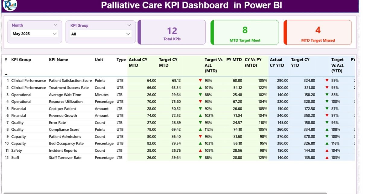 A Palliative Care KPI Dashboard in Power BI is a data visualization tool designed to track and analyze healthcare performance metrics specifically for palliative care services.