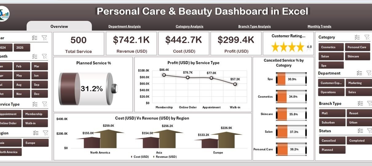 A Personal Care & Beauty Dashboard in Excel is an interactive tool designed to help salon owners, spa managers, and beauty professionals monitor their performance metrics.