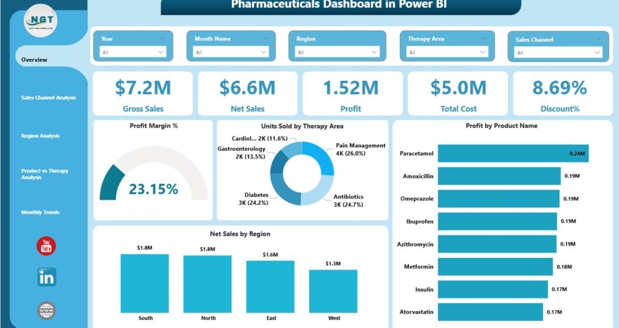 The pharmaceutical industry moves fast. Regulations change often. Competition grows every year. Pricing pressure increases across markets. Moreover, companies must balance innovation, compliance, profitability, and safety at the same time.However, many pharma companies still depend on scattered spreadsheets and delayed reports. As a result, leaders struggle to track sales trends, discount impact, regional performance, and therapy profitability in real time.So, how can pharmaceutical companies gain full visibility across products, regions, and channels?You need a Pharmaceuticals Dashboard in Power BI.This comprehensive dashboard centralizes sales, cost, profit, therapy performance, and ESG indicators into one powerful reporting system. Therefore, executives, finance teams, and sales managers can make faster and smarter decisions.