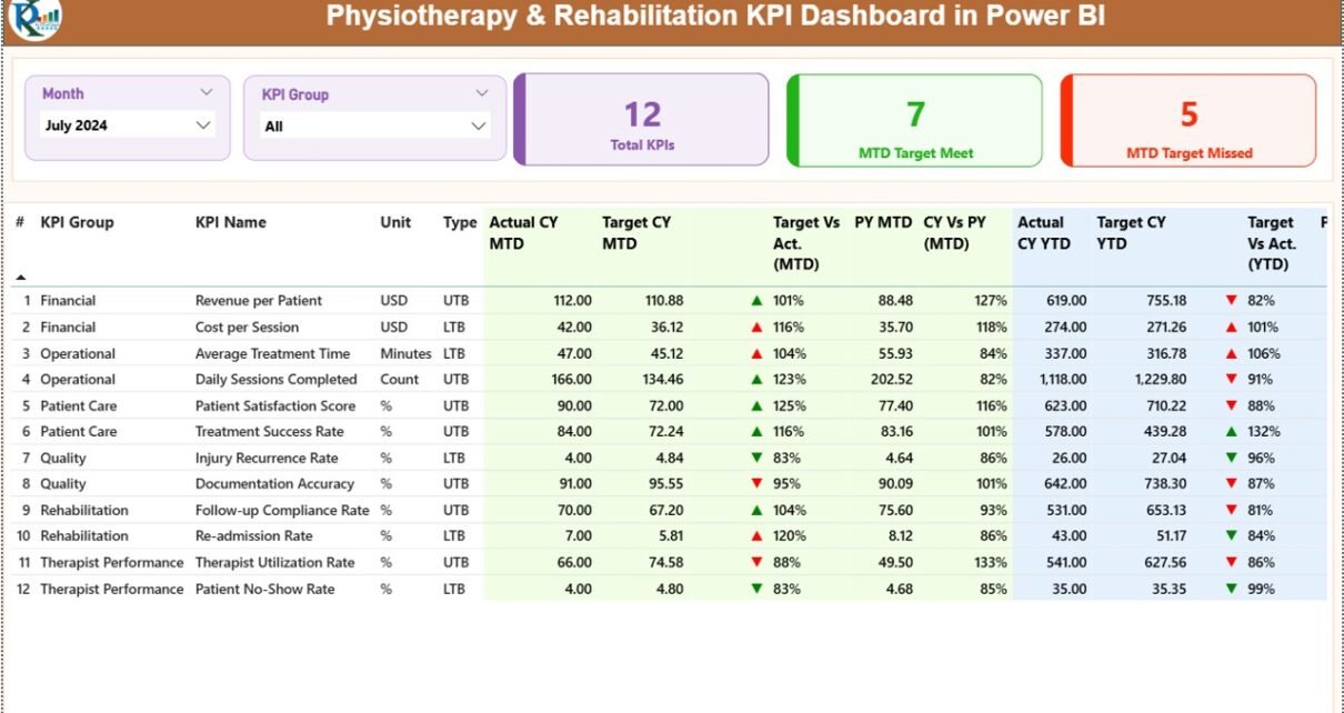 Key Features of the Physiotherapy & Rehabilitation KPI Dashboard in Power BI