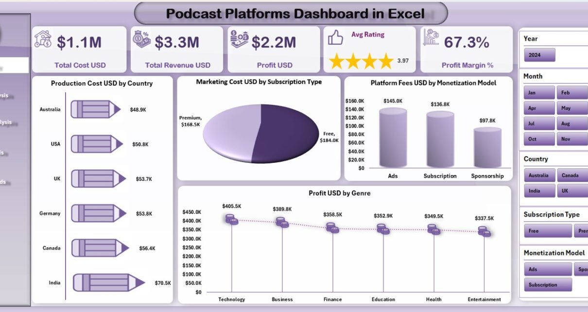 A Podcast Platforms Dashboard in Excel is a structured, interactive reporting tool built to analyze podcast business performance across platforms, hosts, countries, subscription models, and time periods.