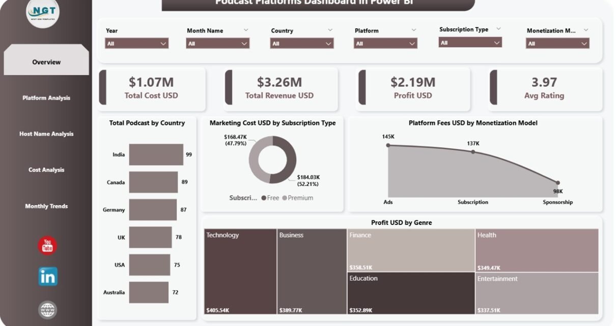 A Podcast Platforms Dashboard in Power BI is a dynamic business intelligence solution designed to analyze podcast performance across different platforms, countries, and monetization models.