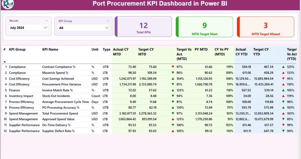 A Port Procurement KPI Dashboard is a Power BI report that tracks procurement performance using key metrics such as cost, targets, and efficiency.