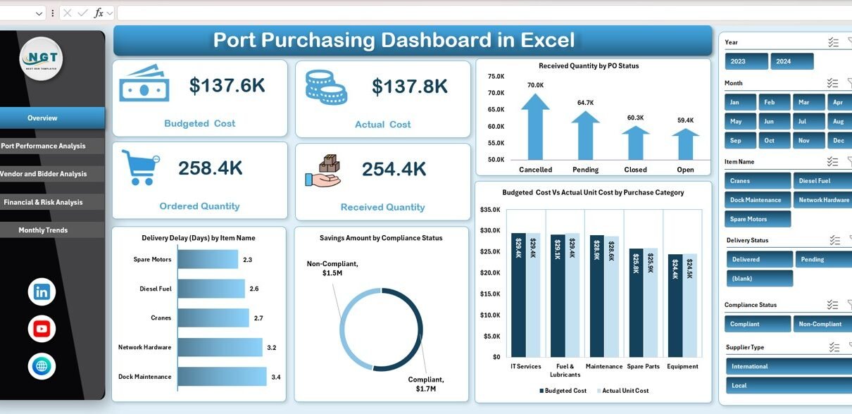 That is exactly why a Port Purchasing Dashboard in Excel plays a critical role. This ready-to-use dashboard converts raw purchasing data into clear, visual, and actionable insights. It allows procurement teams to monitor budgeted cost, actual cost, quantities ordered and received, supplier performance, savings, and delivery delays—all in one place.