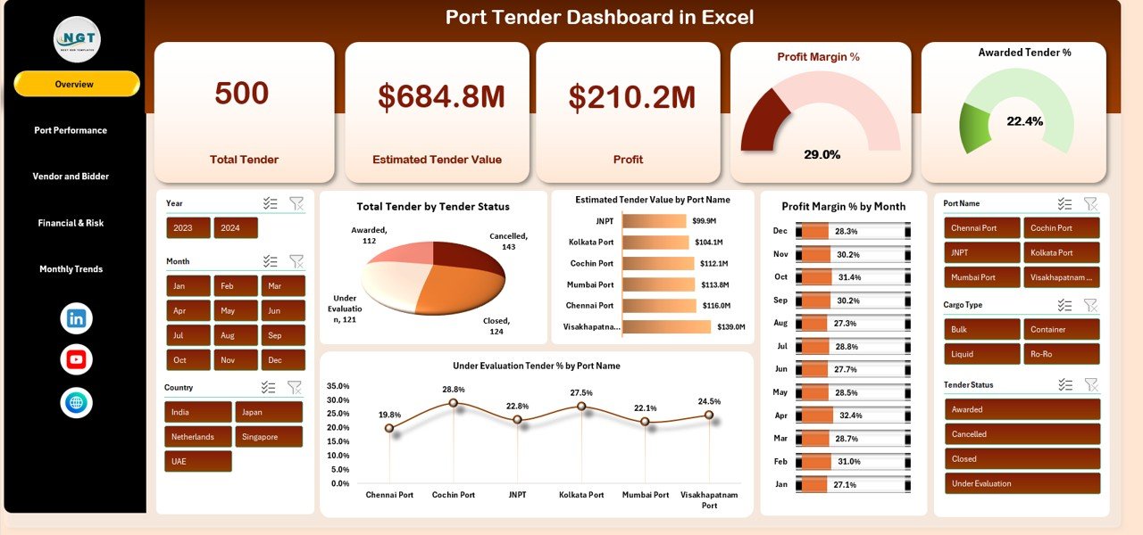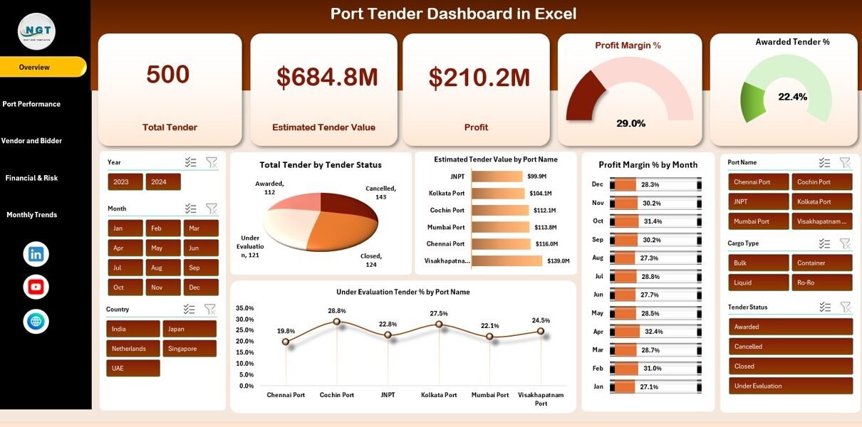 A Port Tender Dashboard in Excel is a structured reporting and analytics tool designed to track and analyze port-related tenders in one place. Instead of manually reviewing tender lists and financial statements, this dashboard converts tender data into interactive charts and KPI cards.