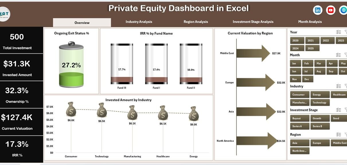 A Private Equity Dashboard in Excel is a structured, visual, and interactive reporting tool designed to track key private equity metrics such as invested amount, current valuation, ownership percentage, IRR, MOIC, and exit status.