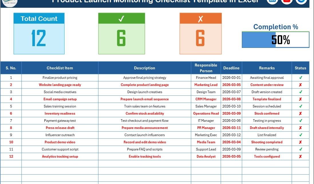 1️⃣ Product Launch Monitoring Checklist Sheet (Main Sheet)