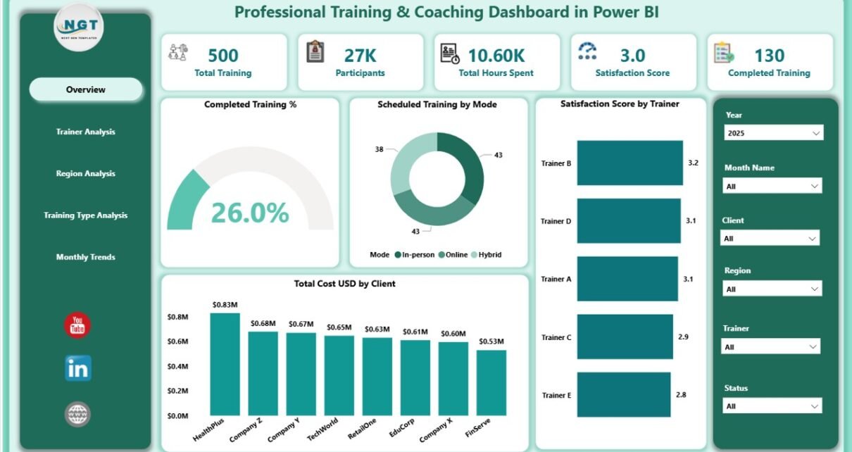 A Professional Training & Coaching Dashboard in Power BI is an analytical tool designed to monitor, measure, and evaluate the performance of training and coaching programs. It consolidates multiple data points — such as training completion rates, satisfaction scores, cost metrics, and trainer performance — into one visually rich, interactive dashboard.