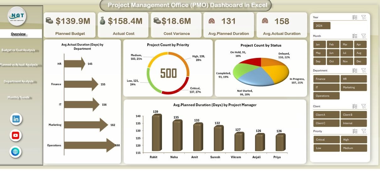 Because of this, PMO leaders can quickly identify risks, delays, and overruns before they impact business outcomes.Project Management Office (PMO) Dashboard in Excel