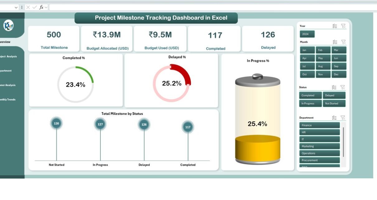 A Project Milestone Tracking Dashboard is an interactive Excel tool that consolidates all your project-related data — including timelines, budgets, owners, and completion rates — into one dynamic interface.