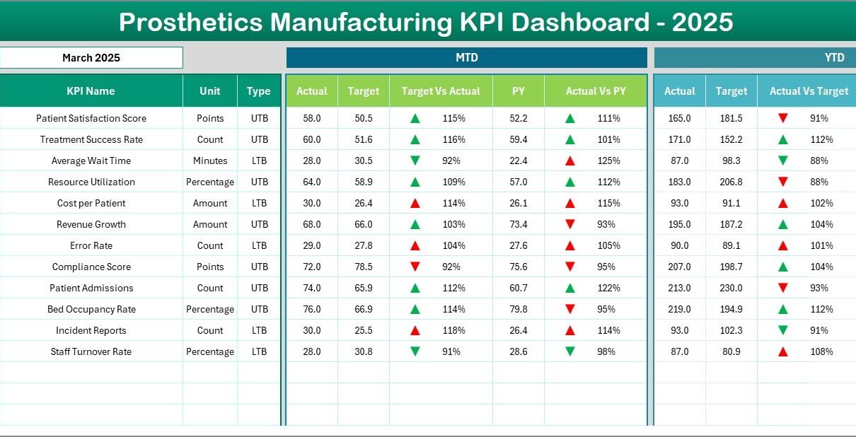 Prosthetics Manufacturing KPI Dashboard in Excel