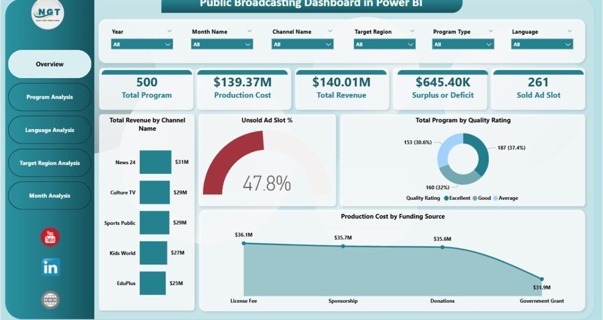 One powerful analytics solution is the Public Broadcasting Dashboard in Power BI. This interactive dashboard helps broadcasting organizations track program performance, monitor production costs, analyze advertising revenue, and evaluate operational efficiency in a structured and visual way.