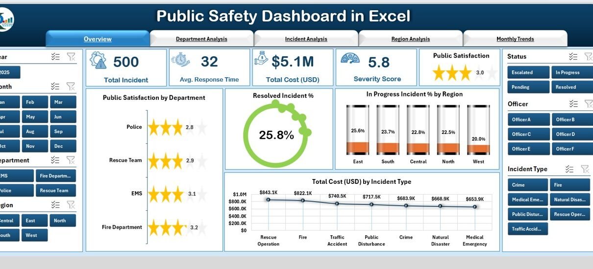 A Public Safety Dashboard in Excel is a pre-built analytical tool designed to help public safety organizations track and analyze incidents across departments, regions, and time periods.