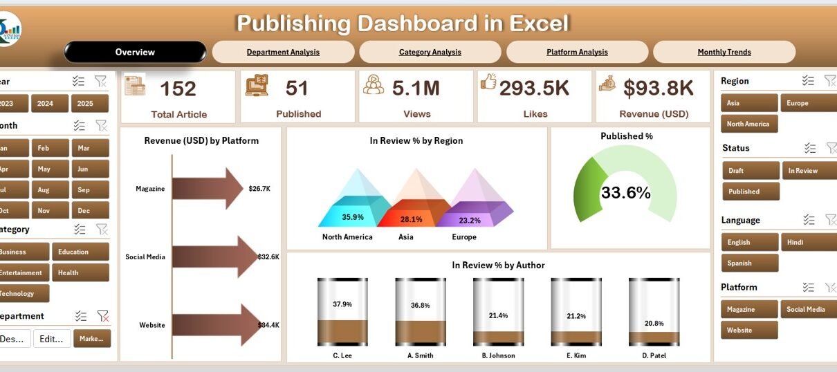 By using Excel’s dynamic features — such as pivot tables, slicers, charts, and formulas — this dashboard eliminates the need for complex BI tools. You can monitor real-time publishing metrics, compare performance trends, and improve decision-making directly in Excel without advanced coding or add-ins.