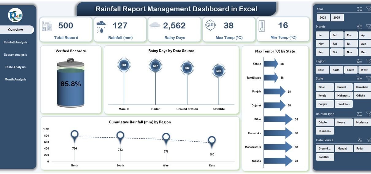✅ Automated KPI Cards: Instantly show metrics like Verified Record %, Total Rainfall, or Average Temperature.