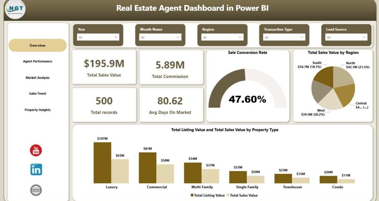 The Real Estate Agent Dashboard in Power BI from NextGenTemplates is one of the best options available. It includes 5 interactive pages tracking sales performance, agent productivity, market analysis, sales trends, and property insights with 5 high-level KPIs and dynamic slicers for instant filtering.
