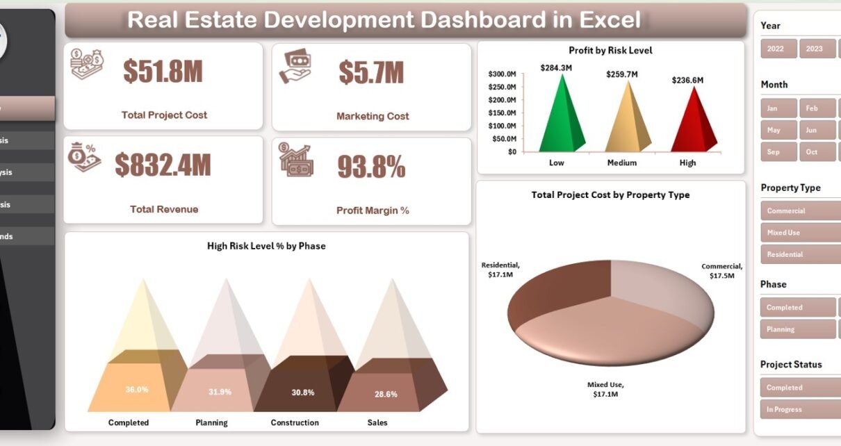 A Real Estate Development Dashboard in Excel is an interactive reporting and analysis tool designed to track and visualize real estate project performance. It consolidates data related to project costs, revenues, phases, cities, property types, risks, and profit margins into one structured Excel dashboard.