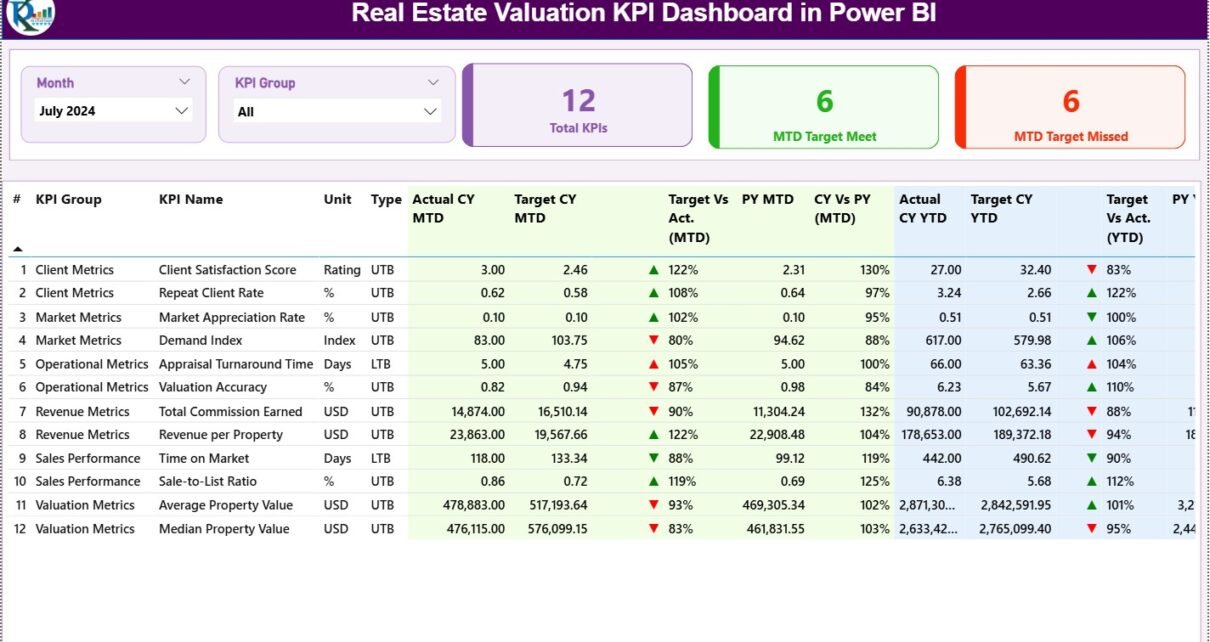 Instead of looking at individual reports for each month or property category, this dashboard brings all critical KPIs together. Consequently, users can instantly see whether valuation targets meet expectations or fall short.