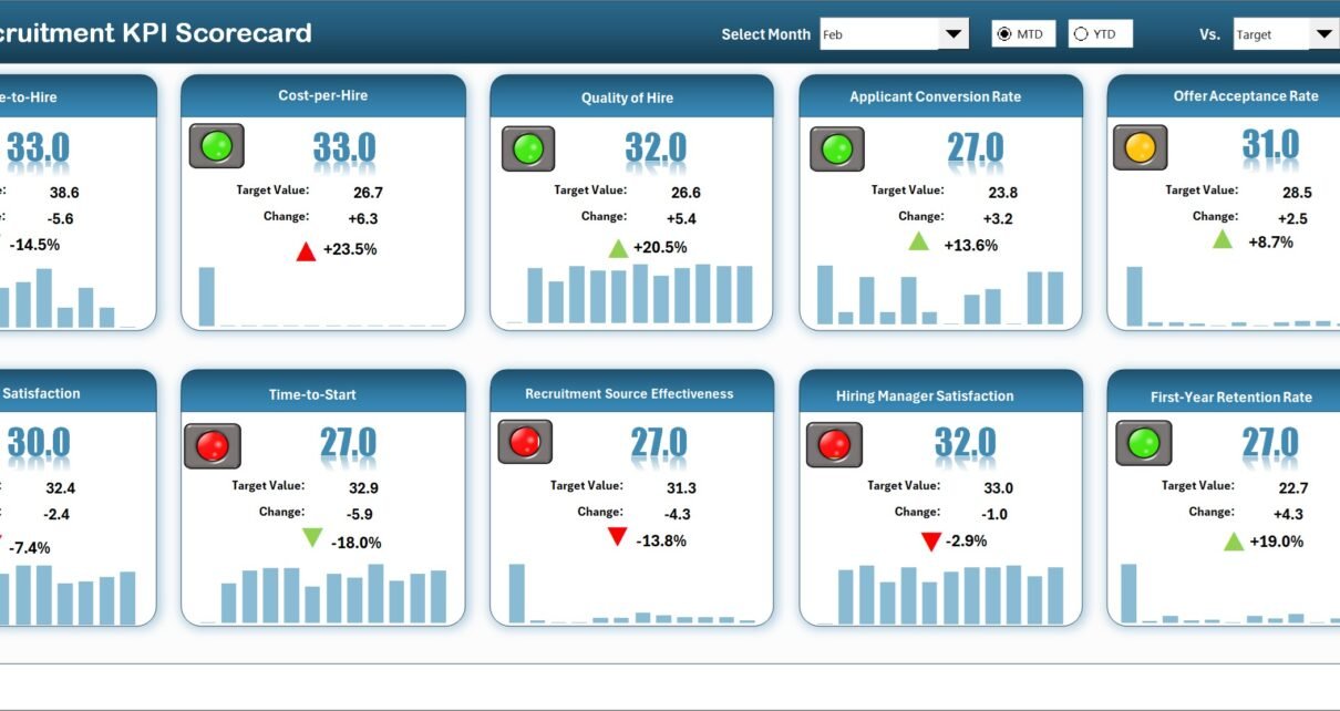 The Recruitment KPI Scorecard is a powerful solution for HR professionals aiming to optimize recruitment efforts through structured measurement and insightful analysis. Its combination of flexible data entry, automated visual indicators, and trending capabilities makes it an indispensable tool for achieving recruitment excellence.
