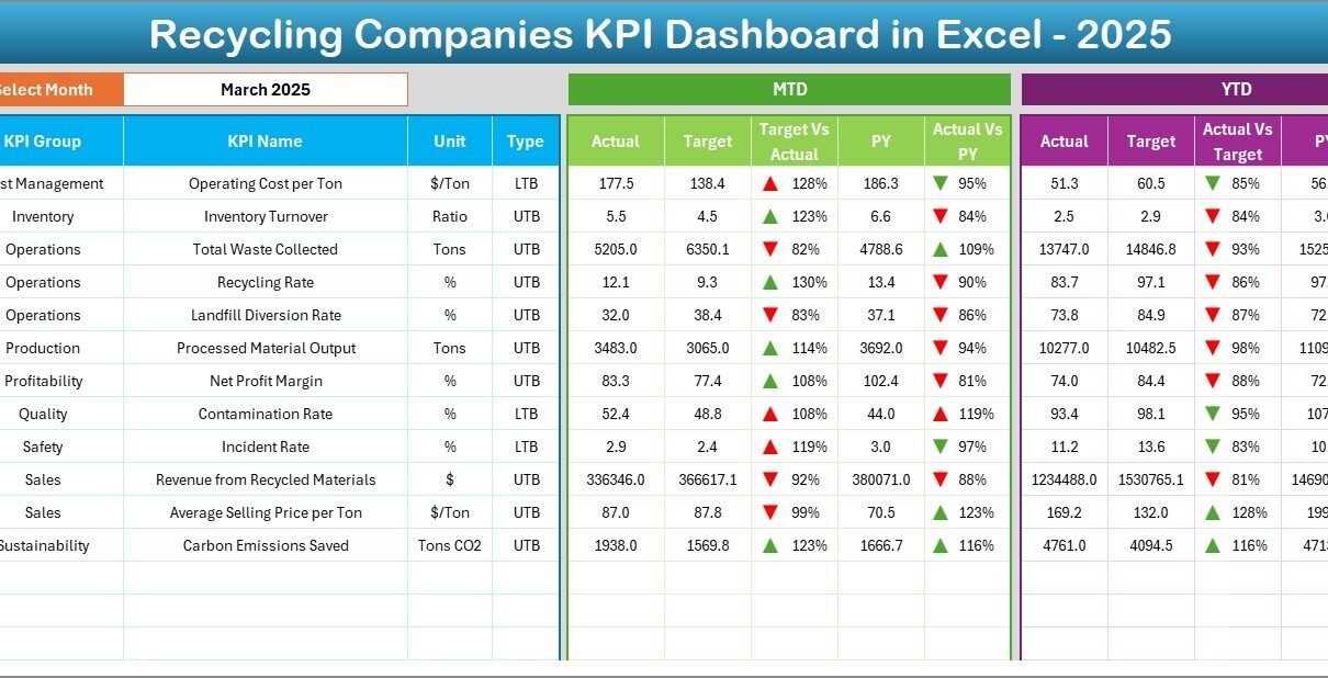 A Recycling Companies KPI Dashboard in Excel is a structured performance management tool designed to track, measure, and analyze recycling operations using measurable indicators.