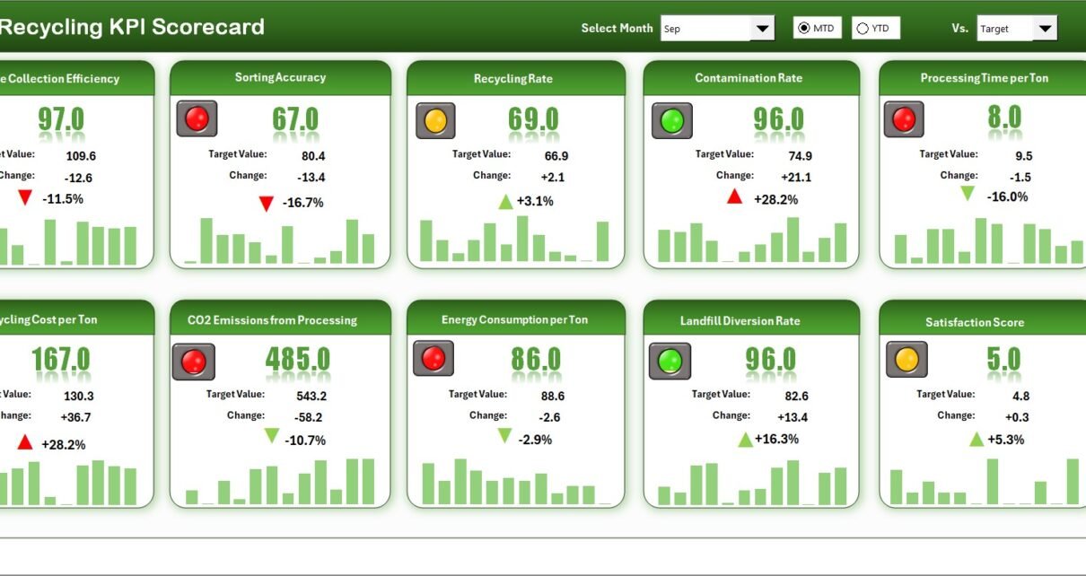 A Recycling KPI Scorecard is a structured Excel-based performance monitoring tool that tracks the key performance indicators (KPIs) of recycling and waste management operations.