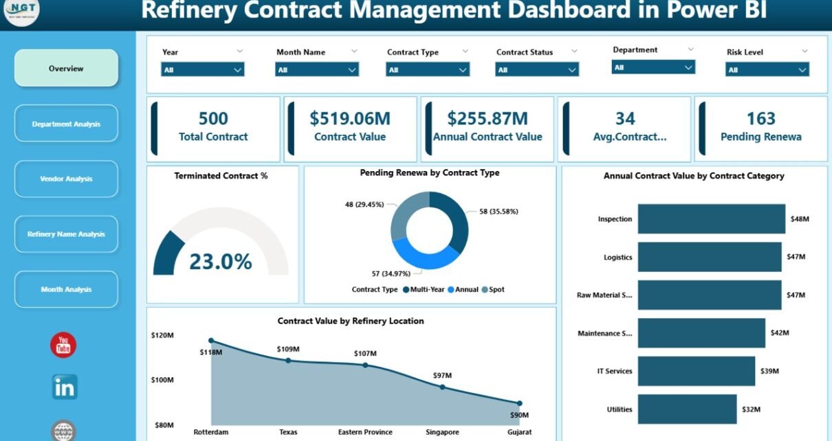 A Refinery Contract Management Dashboard in Power BI is an interactive business intelligence solution that helps refinery organizations track, analyze, and manage contract-related data using visual reports and KPIs.