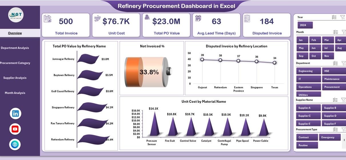 The Refinery Procurement Dashboard in Excel is a powerful, easy-to-use, and highly effective tool for managing procurement operations in refineries.