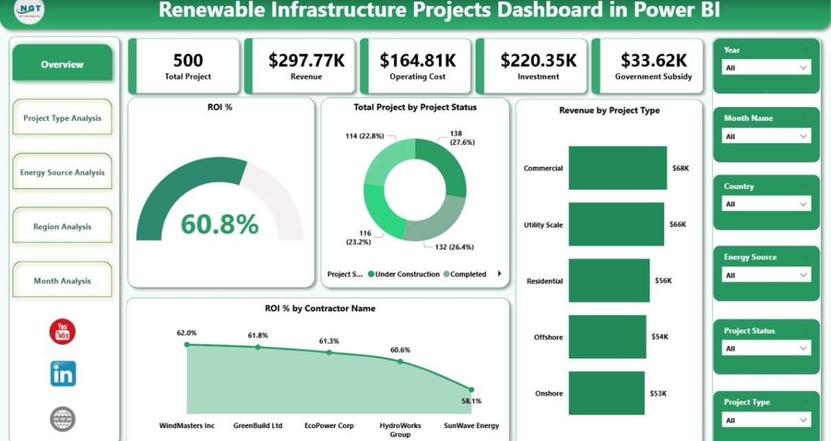 A Renewable Infrastructure Projects Dashboard in Power BI is an interactive reporting solution built in Microsoft Power BI Desktop. It helps you track, analyze, and optimize renewable energy projects such as: