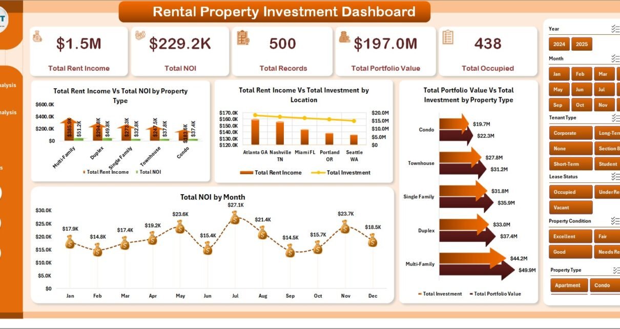Rental Property Investment Dashboard in Excel is one of the most powerful and comprehensive Excel-based analytics tools available for real estate investors, property managers, landlords, and financial analysts. Designed to track rental income, occupancy rates, return on investment, and portfolio valuation across your entire property portfolio, this dashboard template provides everything you need to make data-driven investment decisions without any advanced Excel skills.