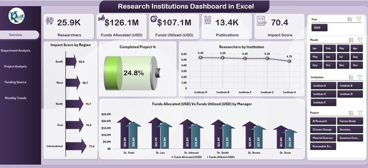 The Research Institutions Dashboard in Excel is more than just a reporting tool—it is a strategic asset for research-driven organizations. By combining project performance, departmental analysis, funding efficiency, and monthly trends into one platform, institutions can ensure transparency, accountability, and better decision-making.