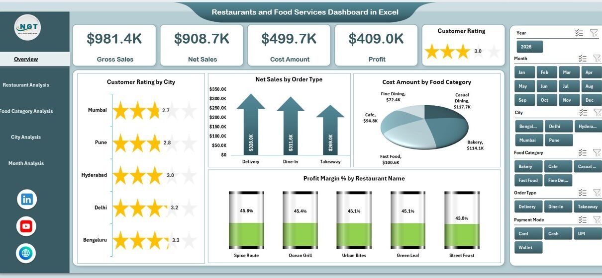 A Restaurants and Food Services Dashboard in Excel is a ready-to-use, interactive reporting and analytics tool designed to track restaurant performance in one centralized Excel file.
