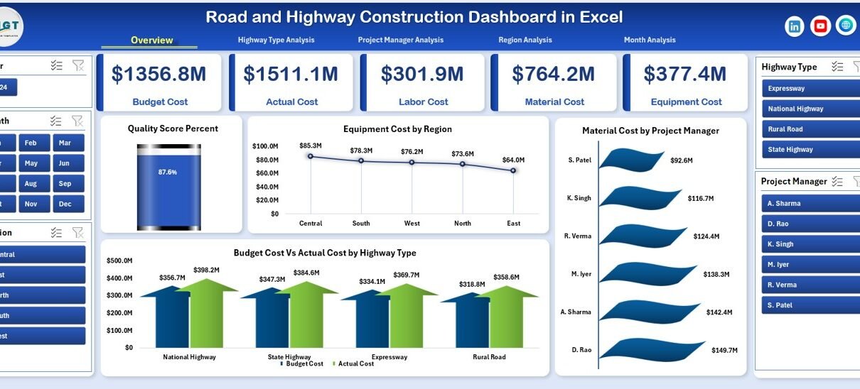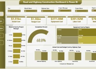The Road and Highway Construction Dashboard in Excel solves this problem effectively. It centralizes cost data, compares budget vs actual performance, tracks regional efficiency, and measures quality scores.