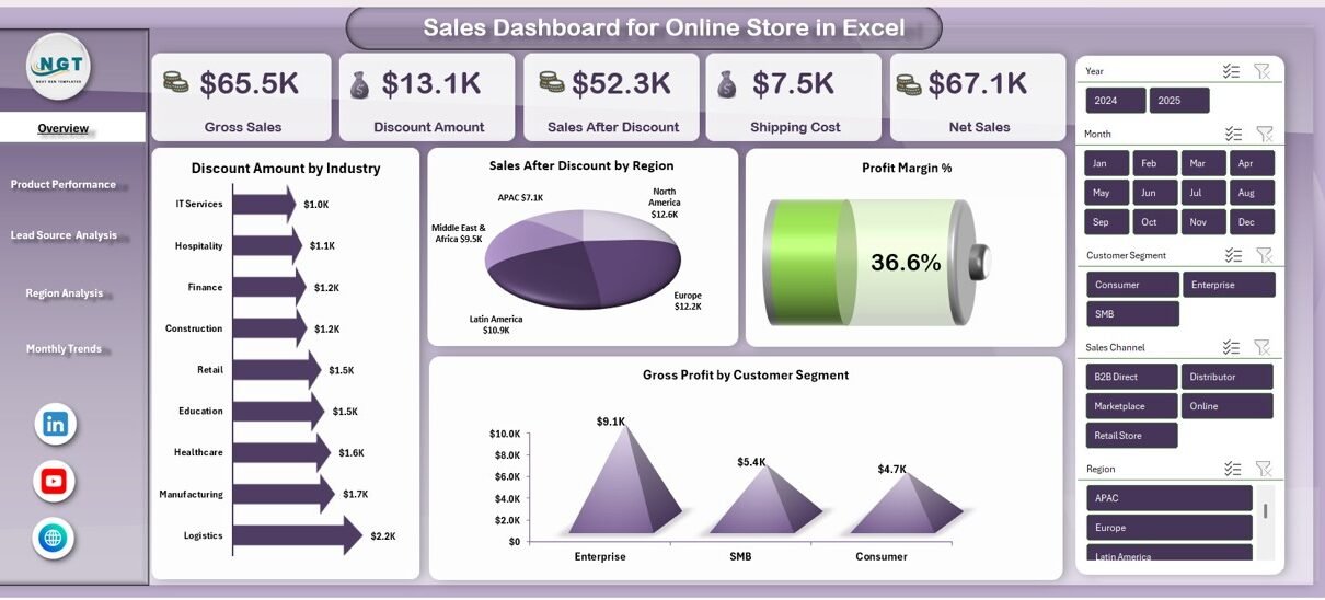 A Sales Dashboard for Online Store in Excel is a ready-to-use analytical tool that tracks, analyzes, and visualizes e-commerce sales data in one place. Instead of checking multiple reports, you get a consolidated view of sales, discounts, shipping costs, profit margins, and trends.