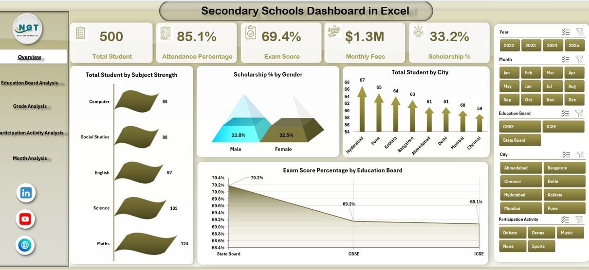 A Secondary Schools Dashboard in Excel transforms scattered school data into meaningful insights. It helps administrators track students, attendance, exam scores, scholarships, fees, and participation activities from one place.