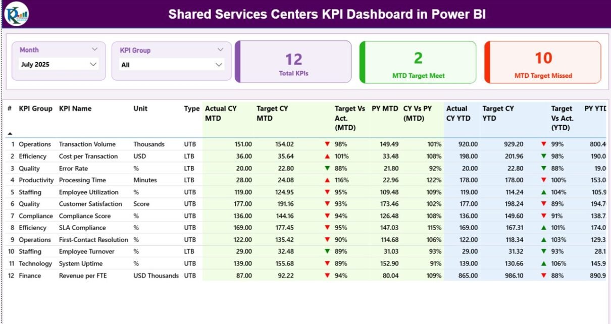 The Shared Services Centers KPI Dashboard in Power BI is a ready-to-use analytics solution designed to track KPI performance, compare targets with actual results, monitor trends, and identify operational gaps. Because Power BI provides interactive visualization capabilities, users can easily analyze performance metrics and make faster decisions.