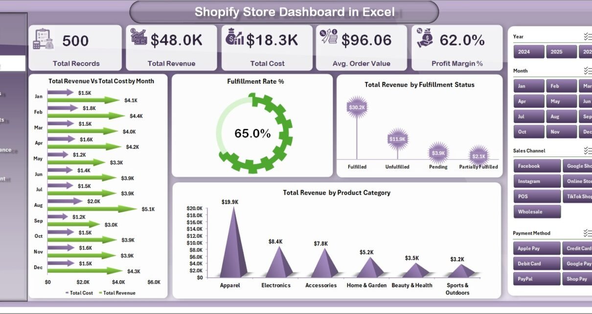Shopify Store Dashboard in Excel is a powerful, ready-to-use analytics template designed for Shopify store owners, e-commerce managers, and business analysts who want to track sales performance, monitor fulfillment efficiency, and analyze profitability — all inside a single Excel workbook. This Excel Dashboard Template transforms raw Shopify order data into clear visual insights with 5 interactive dashboard pages, dynamic pivot charts, KPI cards, and slicers for instant filtering.