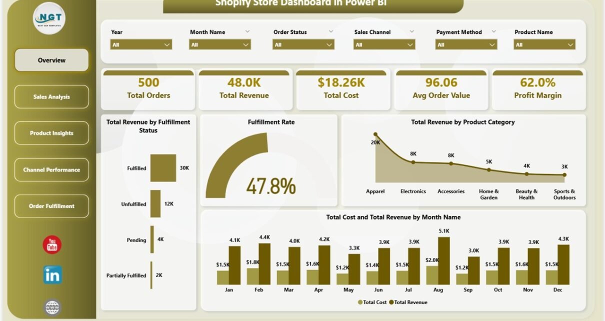 The Overview Page provides a high-level snapshot of your entire Shopify store performance. At the top, KPI cards display Total Orders, Total Revenue, Total Cost, Avg Order Value, and Profit Margin %. Below, dynamic charts visualize Total Revenue by Fulfillment Status, Fulfillment Rate, Total Revenue by Product Category, and Total Cost and Total Revenue by Month Name. Multiple slicers allow instant filtering across all dimensions.