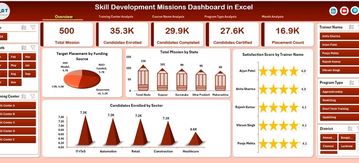 A Skill Development Missions Dashboard in Excel is a ready-to-use analytical system designed to monitor, analyze, and manage skill training programs using structured data and interactive visual reports.