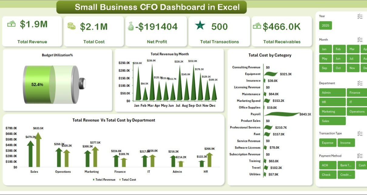 The Overview page is the main landing view of the Small Business CFO Dashboard in Excel. At the top, you will find 5 KPI cards showing Total Revenue, Total Cost, Net Profit, Total Transactions, and Total Receivables. Below the cards, 4 interactive charts provide quick financial analysis: Budget Utilization by Percentage shows how much of your allocated budget has been used, Total Revenue by Month reveals seasonal trends and growth patterns, Total Cost by Category breaks down where your money is being spent, and Total Revenue Vs Total Cost by Department lets you compare financial performance across your organizational structure. Multiple slicers are available to filter the entire page and see filtered results instantly.