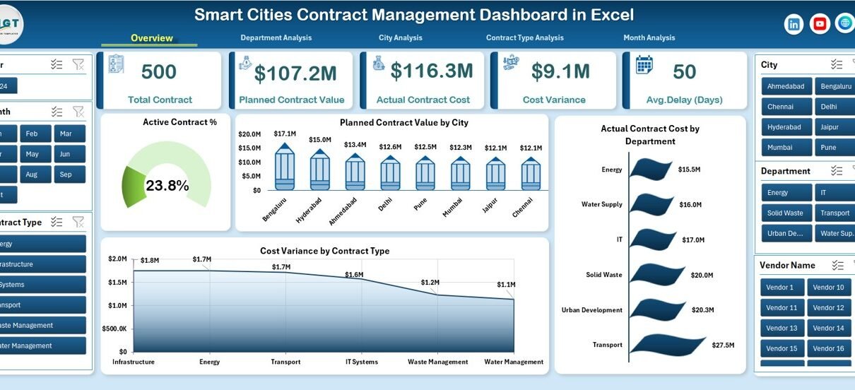That is exactly why a Smart Cities Contract Management Dashboard in Excel plays a critical role. This ready-to-use Excel dashboard converts complex contract data into clear, visual, and actionable insights. Moreover, it helps decision-makers track performance, control costs, and improve accountability—without investing in expensive BI tools.