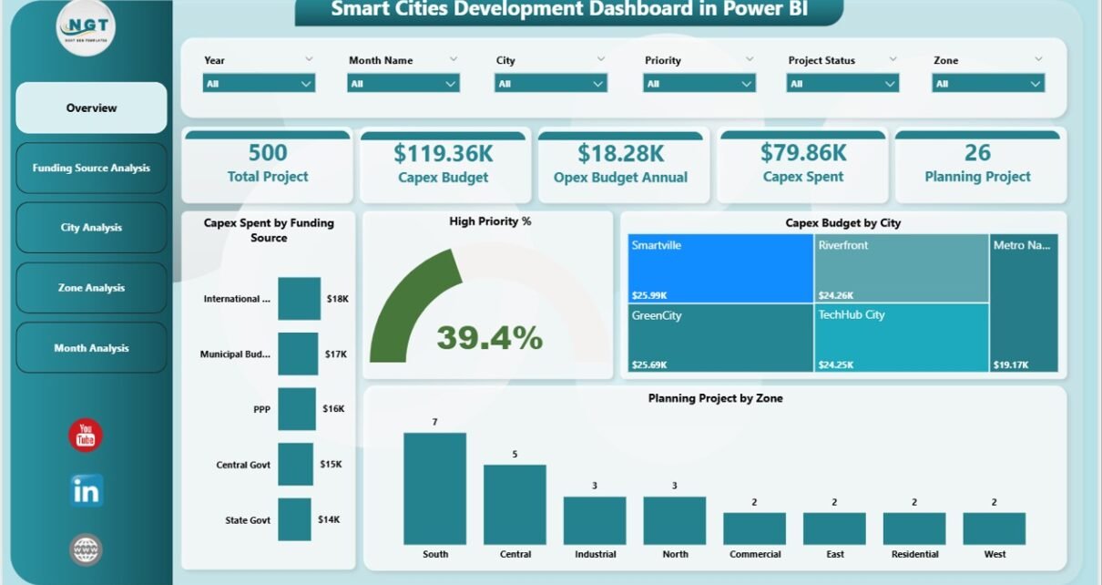 This Smart Cities Development Dashboard includes 5 well-structured pages, each designed to answer specific planning and financial questions. Let us explore each page in detail.