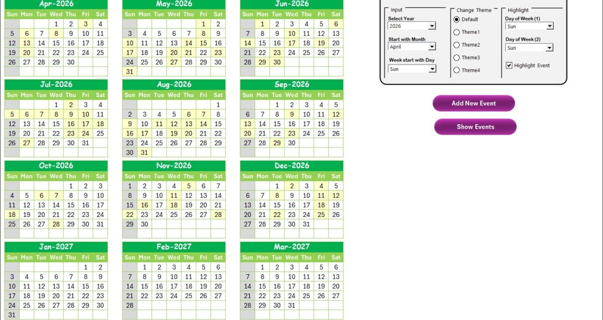 - Input Group: Customize year, starting month, and starting day of the week to tailor the annual view.