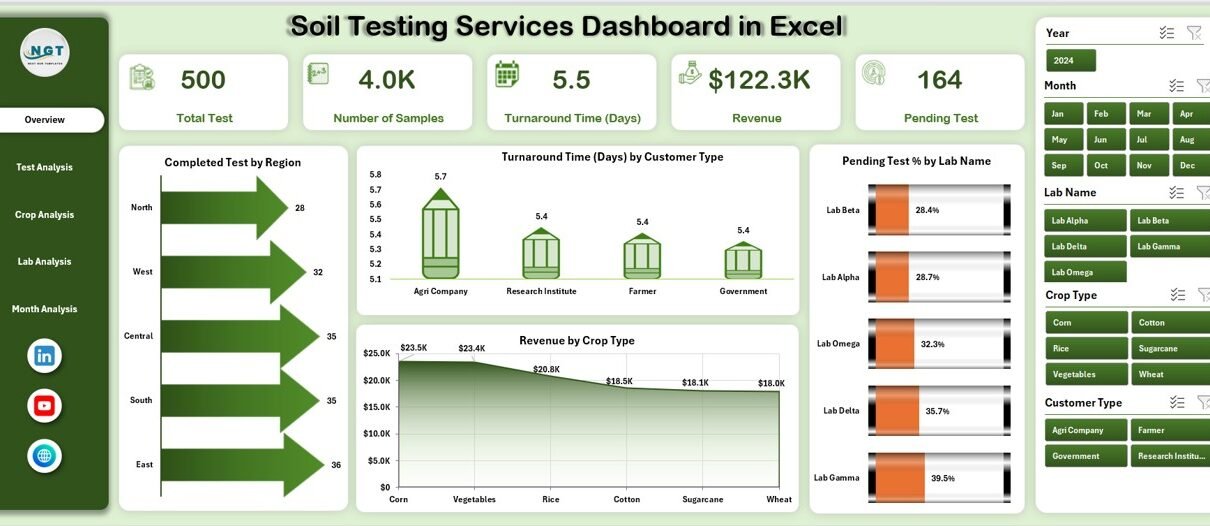 A Soil Testing Services Dashboard in Excel is a ready-to-use analytical tool designed to monitor, analyze, and visualize soil testing operations. It consolidates data related to soil samples, test types, crops, laboratories, turnaround time, pending tests, and revenue into one interactive Excel file.