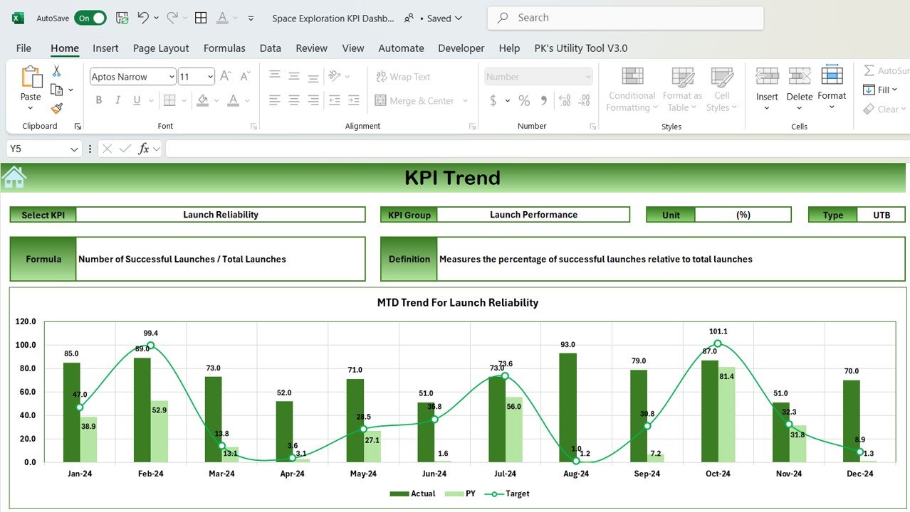 The Dashboard Sheet displays all KPIs related to space exploration. It is dynamic, allowing users to select the month from a dropdown (located at Range D3). The dashboard updates automatically, providing MTD (Month-to-Date) and YTD (Year-to-Date) values, targets, and previous year comparisons, all with visual indicators such as up and down arrows based on conditional formatting.