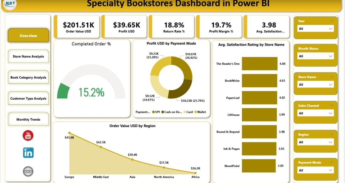 The Overview Page serves as the first and most important page of the Specialty Bookstores Dashboard in Power BI. It provides a quick snapshot of overall business health.