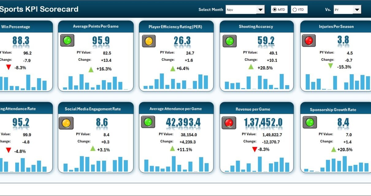 Instead of manually collecting and reviewing multiple sheets of statistics, this scorecard consolidates all critical metrics — such as player efficiency, team performance, injury rates, and financial outcomes — into one clean and dynamic dashboard.